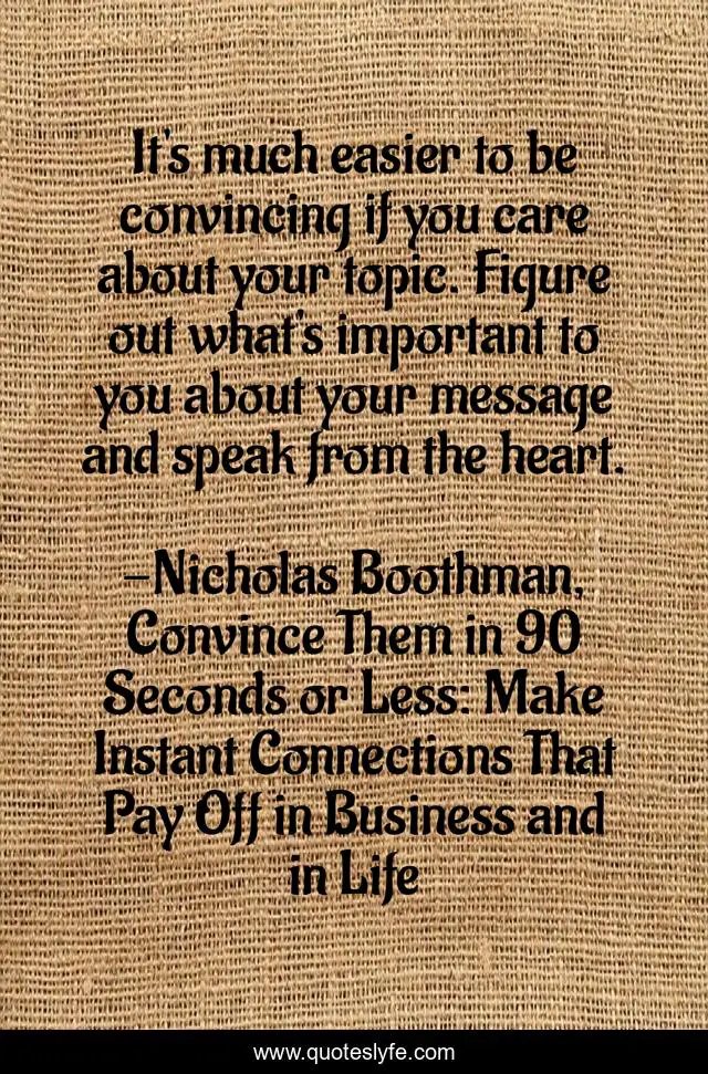 This page presents the quote "It's much easier to be convincing if you care about your topic. Figure out what's important to you about your message and speak from the heart.". Author of this quote is Nicholas Boothman, Convince Them in 90 Seconds or Less: Make Instant Connections That Pay Off in Business and in Life. This quote is about communication, persuasion, public-speaking,.