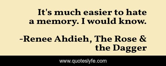 This page presents the quote "It's much easier to hate a memory. I would know.". Author of this quote is Renee Ahdieh, The Rose & the Dagger. This quote is about hate, memory,.