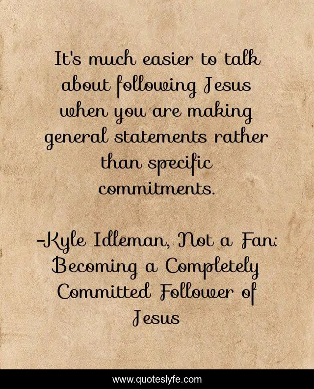 This page presents the quote "It's much easier to talk about following Jesus when you are making general statements rather than specific commitments.". Author of this quote is Kyle Idleman, Not a Fan: Becoming a Completely Committed Follower of Jesus. .