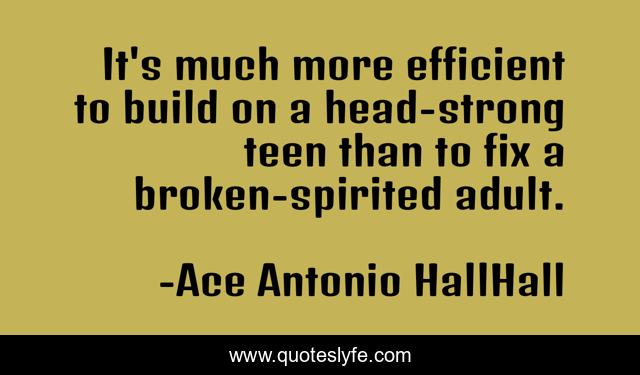 This page presents the quote "It's much more efficient to build on a head-strong teen than to fix a broken-spirited adult.". Author of this quote is Ace Antonio HallHall. This quote is about quote, inspirational-philosophy, inspiration,.