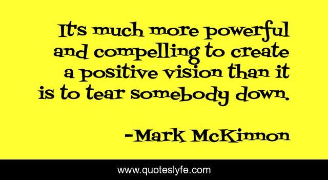 This page presents the quote "It's much more powerful and compelling to create a positive vision than it is to tear somebody down.". Author of this quote is Mark McKinnon. This quote is about down, powerful, vision,.