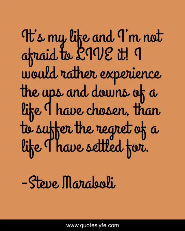 This page presents the quote "It’s my life and I’m not afraid to LIVE it! I would rather experience the ups and downs of a life I have chosen, than to suffer the regret of a life I have settled for.". Author of this quote is Steve Maraboli. This quote is about life, regret, success, motivation, truth, inspiration,.