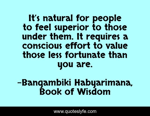 This page presents the quote "It’s natural for people to feel superior to those under them. It requires a conscious effort to value those less fortunate than you are.". Author of this quote is Bangambiki Habyarimana, Book of Wisdom. This quote is about wise-sayings, words-to-ponder, wise, words-to-live-by, nature,.