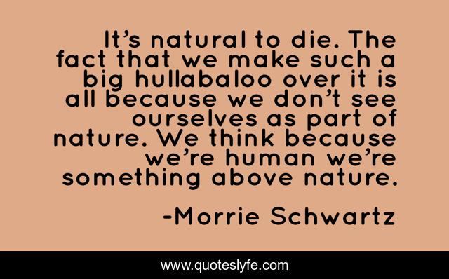 This page presents the quote "It’s natural to die. The fact that we make such a big hullabaloo over it is all because we don’t see ourselves as part of nature. We think because we’re human we’re something above nature.". Author of this quote is Morrie Schwartz. This quote is about life, death, natural, human,.