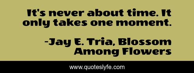 This page presents the quote "It's never about time. It only takes one moment.". Author of this quote is Jay E. Tria, Blossom Among Flowers. This quote is about falling-in-love, love, affection,.
