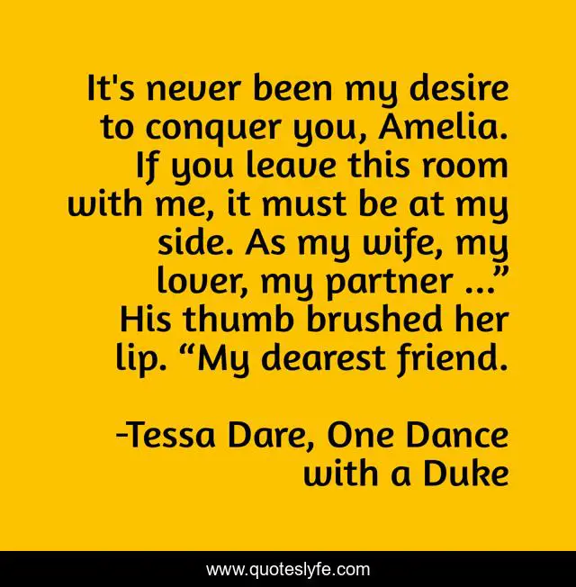 This page presents the quote "It's never been my desire to conquer you, Amelia. If you leave this room with me, it must be at my side. As my wife, my lover, my partner ...” His thumb brushed her lip. “My dearest friend.". Author of this quote is Tessa Dare, One Dance with a Duke. This quote is about friendship, love, affection, endearment,.