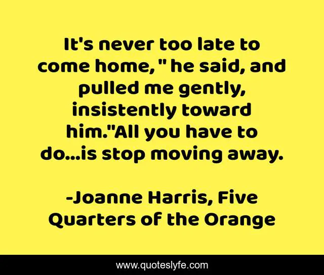 This page presents the quote "It's never too late to come home, " he said, and pulled me gently, insistently toward him."All you have to do...is stop moving away.". Author of this quote is Joanne Harris, Five Quarters of the Orange. This quote is about home, belonging, love, affection,.