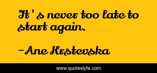 This page presents the quote "It's never too late to start again.". Author of this quote is Ane Krstevska. This quote is about confidence, positive, motivational, optimistic, inspirational, enthusiasm,.