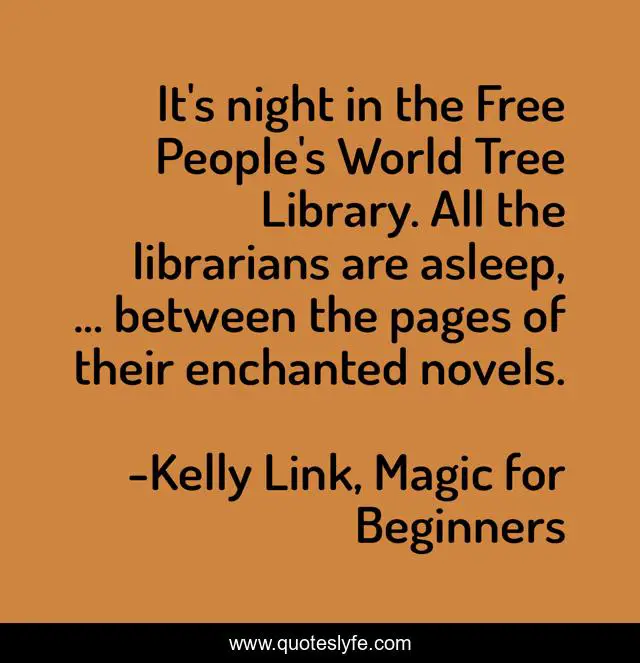 This page presents the quote "It's night in the Free People's World Tree Library. All the librarians are asleep, ... between the pages of their enchanted novels.". Author of this quote is Kelly Link, Magic for Beginners. This quote is about libraries, books,.