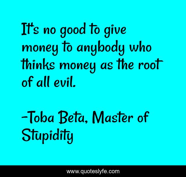 This page presents the quote "It's no good to give money to anybody who thinks money as the root of all evil.". Author of this quote is Toba Beta, Master of Stupidity. This quote is about money, perception,.