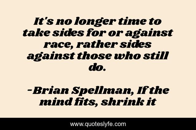 This page presents the quote "It's no longer time to take sides for or against race, rather sides against those who still do.". Author of this quote is Brian Spellman, If the mind fits, shrink it. This quote is about race-and-racism-in-america, race-relations, race, race-in-america,.