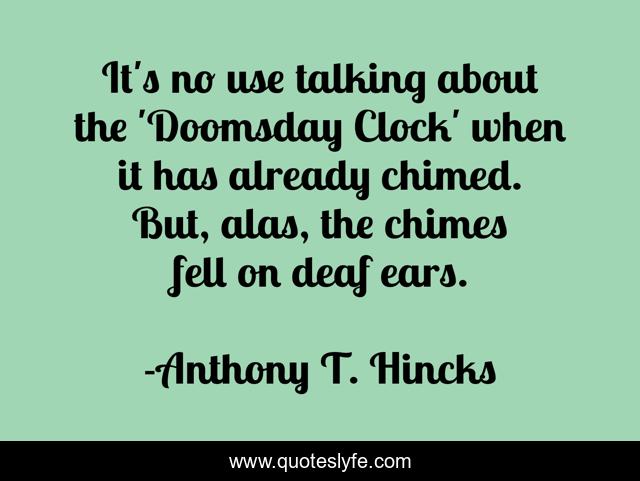 This page presents the quote "It's no use talking about the 'Doomsday Clock' when it has already chimed. But, alas, the chimes fell on deaf ears.". Author of this quote is Anthony T. Hincks. This quote is about chimes, life, death, philosophy, deaf, doomsday, doomsday-clock, man,.