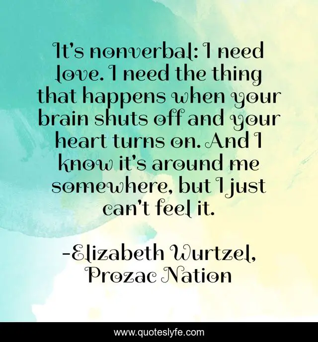This page presents the quote "It's nonverbal: I need love. I need the thing that happens when your brain shuts off and your heart turns on. And I know it's around me somewhere, but I just can't feel it.". Author of this quote is Elizabeth Wurtzel, Prozac Nation. This quote is about memoir, depression,.