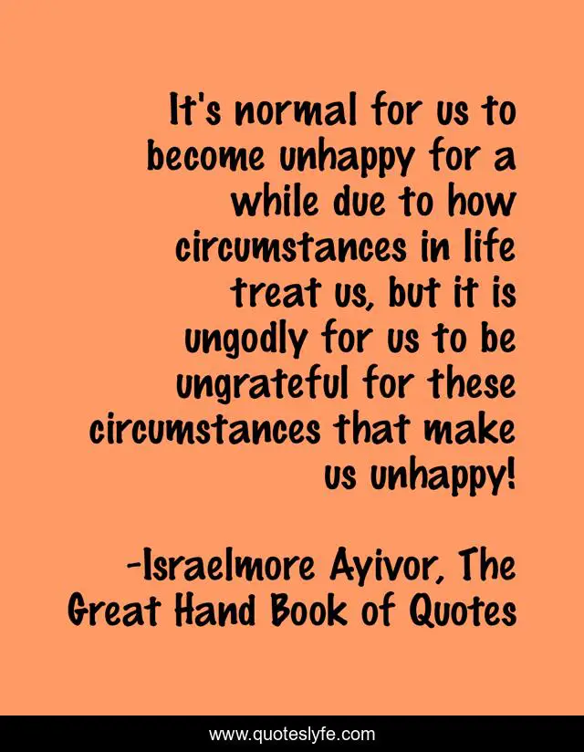 This page presents the quote "It's normal for us to become unhappy for a while due to how circumstances in life treat us, but it is ungodly for us to be ungrateful for these circumstances that make us unhappy!". Author of this quote is Israelmore Ayivor, The Great Hand Book of Quotes. This quote is about ungrateful, food-for-thought, life-experience, grateful, circumstance, normal, life, unhappy, ungodly,.