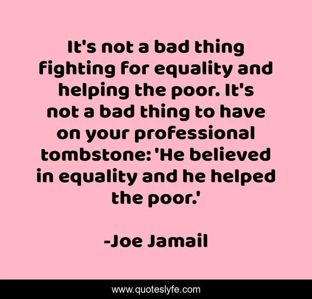 This page presents the quote "It's not a bad thing fighting for equality and helping the poor. It's not a bad thing to have on your professional tombstone: 'He believed in equality and he helped the poor.'". Author of this quote is Joe Jamail. This quote is about poor, professional, fighting,.