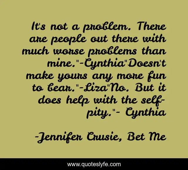 This page presents the quote "It's not a problem. There are people out there with much worse problems than mine."-Cynthia"Doesn't make yours any more fun to bear."-Liza"No. But it does help with the self-pity."- Cynthia". Author of this quote is Jennifer Crusie, Bet Me. This quote is about pity, personal-problems, perspective, best-friends, self-help,.