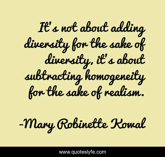 This page presents the quote "It's not about adding diversity for the sake of diversity, it's about subtracting homogeneity for the sake of realism.". Author of this quote is Mary Robinette Kowal. This quote is about twitter, diversity,.