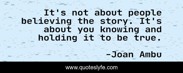 This page presents the quote "It's not about people believing the story. It's about you knowing and holding it to be true.". Author of this quote is Joan Ambu. This quote is about conscience, story, guilt, belief, truth,.