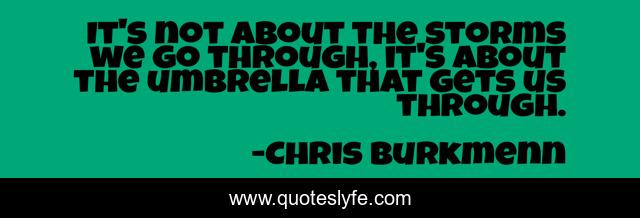 This page presents the quote "It's not about the storms we go through, it's about the umbrella that gets us through.". Author of this quote is Chris Burkmenn. This quote is about faith, god, work, jesus, live, dreams, believe, achieve, goals,.