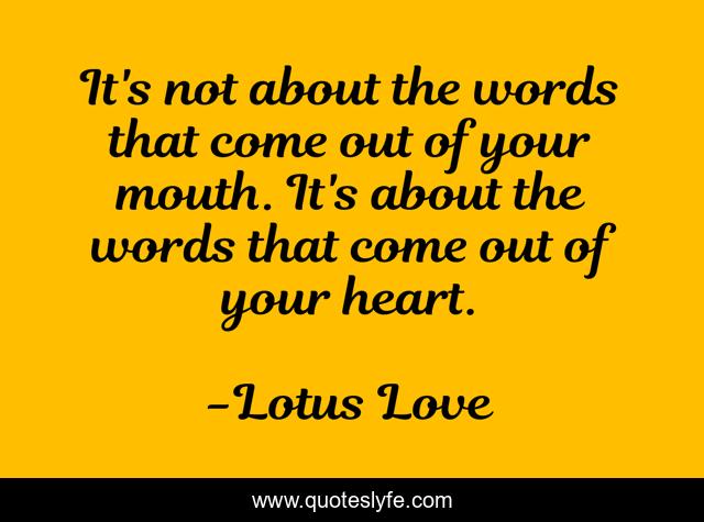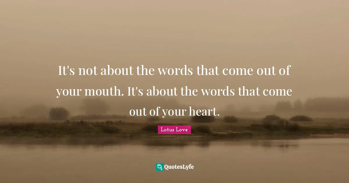 This page presents the quote "It's not about the words that come out of your mouth. It's about the words that come out of your heart.". Author of this quote is Lotus Love. This quote is about motivation, inspired-living, love, inspire, inspire-others, inspired, genuineness, inspired-mind, inspire-change,.