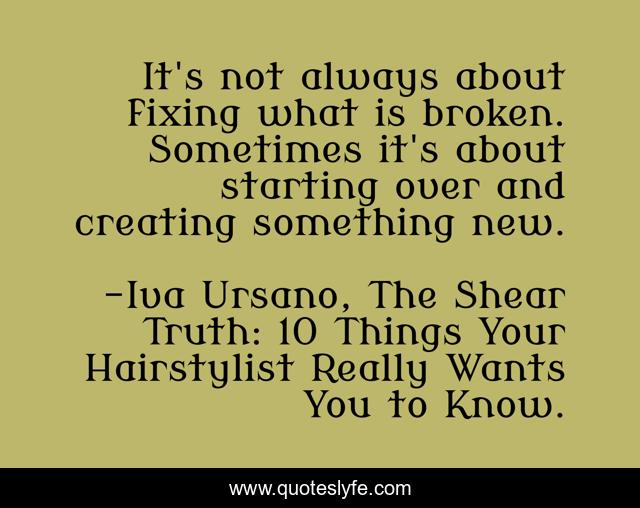 This page presents the quote "It's not always about fixing what is broken. Sometimes it's about starting over and creating something new.". Author of this quote is Iva Ursano, The Shear Truth: 10 Things Your Hairstylist Really Wants You to Know.. This quote is about confidence, inspirational, positive, motivational, optimistic, life-lessons, enthusiasm,.