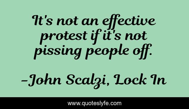 This page presents the quote "It's not an effective protest if it's not pissing people off.". Author of this quote is John Scalzi, Lock In. This quote is about activism, effectiveness, demonstration, protest, social-change,.