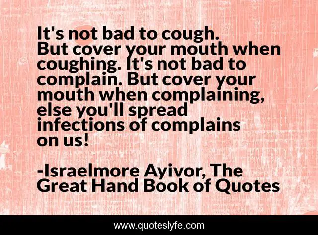This page presents the quote "It's not bad to cough. But cover your mouth when coughing. It's not bad to complain. But cover your mouth when complaining, else you'll spread infections of complains on us!". Author of this quote is Israelmore Ayivor, The Great Hand Book of Quotes. This quote is about complaint, complains, complaining, infections, food-for-thought, infection, cover-your-mouth, bad, spread,.