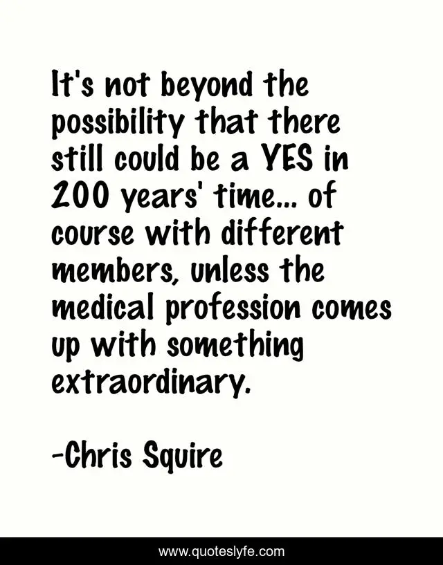 This page presents the quote "It's not beyond the possibility that there still could be a YES in 200 years' time... of course with different members, unless the medical profession comes up with something extraordinary.". Author of this quote is Chris Squire. This quote is about extraordinary, time, years,.