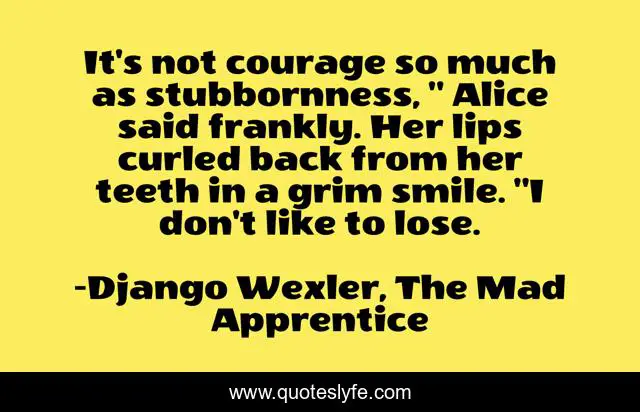 This page presents the quote "It's not courage so much as stubbornness, " Alice said frankly. Her lips curled back from her teeth in a grim smile. "I don't like to lose.". Author of this quote is Django Wexler, The Mad Apprentice. This quote is about reading-books, stubbornness, courage, books,.