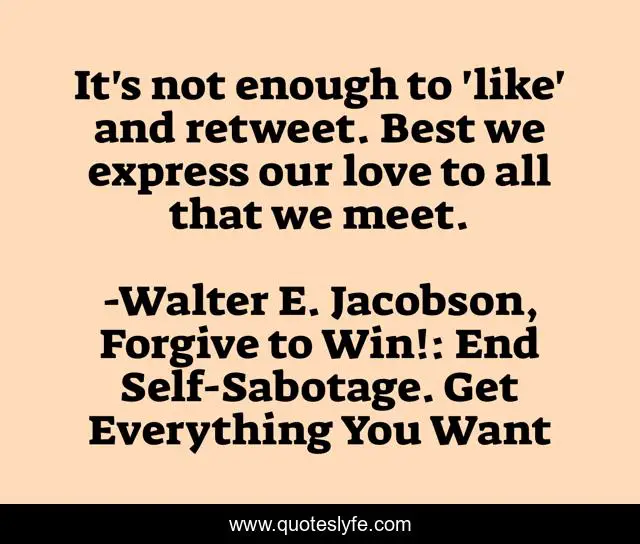 This page presents the quote "It's not enough to 'like' and retweet. Best we express our love to all that we meet.". Author of this quote is Walter E. Jacobson, Forgive to Win!: End Self-Sabotage. Get Everything You Want. This quote is about forgiveness, acceptance, love, affection, self-help,.