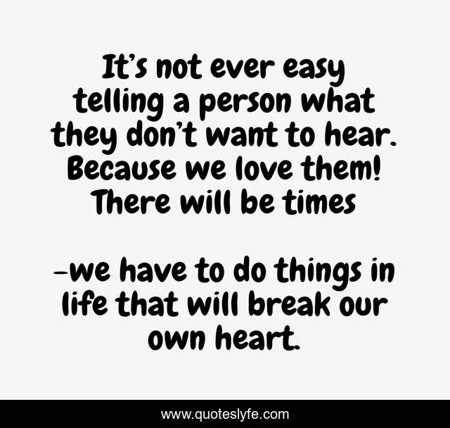 This page presents the quote "It’s not ever easy telling a person what they don’t want to hear. Because we love them! There will be times". Author of this quote is we have to do things in life that will break our own heart.. .
