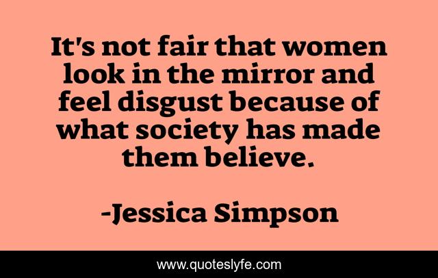 This page presents the quote "It's not fair that women look in the mirror and feel disgust because of what society has made them believe.". Author of this quote is Jessica Simpson. This quote is about society, believe, mirror,.