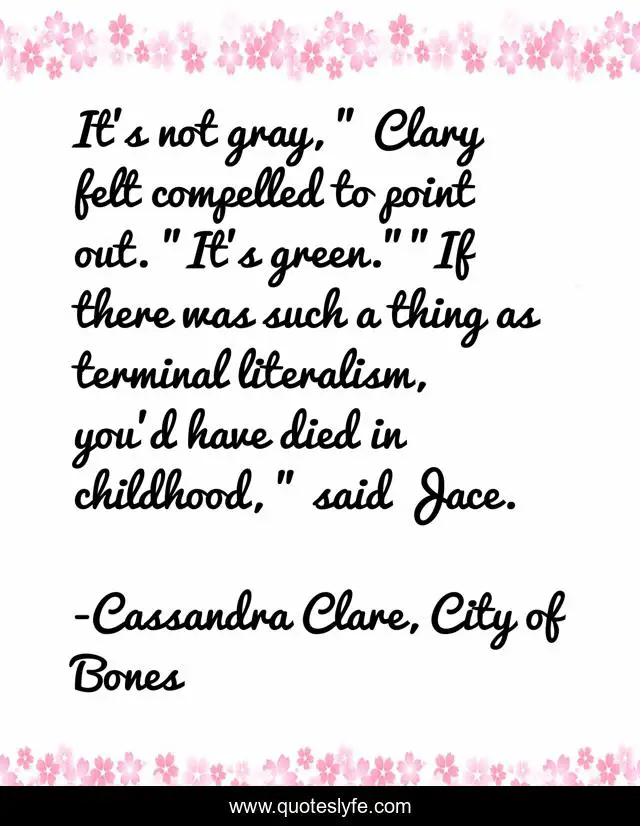 This page presents the quote "It's not gray, " Clary felt compelled to point out. "It's green.""If there was such a thing as terminal literalism, you'd have died in childhood, " said Jace.". Author of this quote is Cassandra Clare, City of Bones. This quote is about gray-book, clary, jace, humor,.