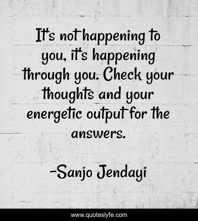 This page presents the quote "It's not happening to you, it's happening through you. Check your thoughts and your energetic output for the answers.". Author of this quote is Sanjo Jendayi. This quote is about energetic, situations, energy, self-actualization, through, sanjo-jendayi, thoughts, happening,.