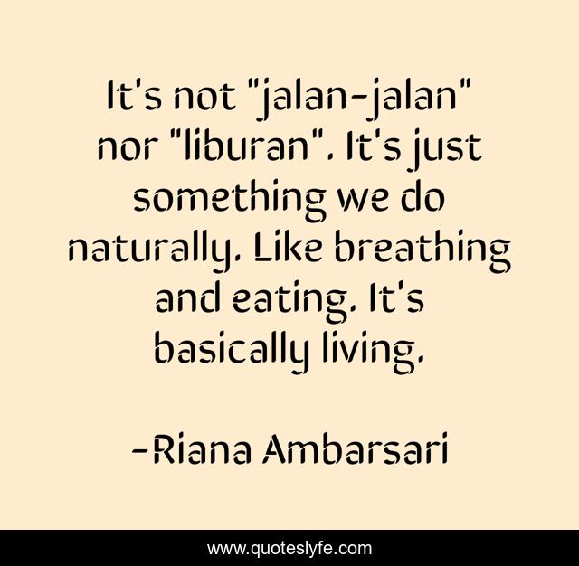 This page presents the quote "It's not "jalan-jalan" nor "liburan". It's just something we do naturally. Like breathing and eating. It's basically living.". Author of this quote is Riana Ambarsari. This quote is about backpacking, traveling, adventure,.