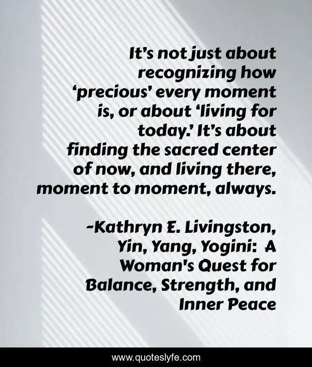 This page presents the quote "It’s not just about recognizing how ‘precious’ every moment is, or about ‘living for today.’ It’s about finding the sacred center of now, and living there, moment to moment, always.". Author of this quote is Kathryn E. Livingston, Yin, Yang, Yogini: A Woman's Quest for Balance, Strength, and Inner Peace. This quote is about wellness, women-s-fiction, yoga,.