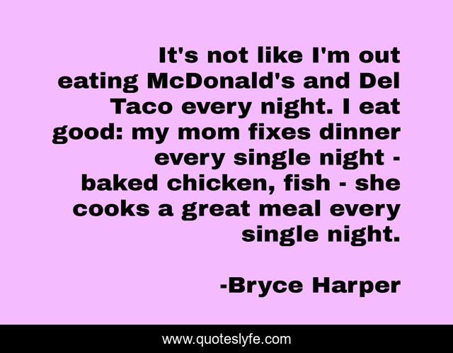 This page presents the quote "It's not like I'm out eating McDonald's and Del Taco every night. I eat good: my mom fixes dinner every single night - baked chicken, fish - she cooks a great meal every single night.". Author of this quote is Bryce Harper. This quote is about great, good, taco,.