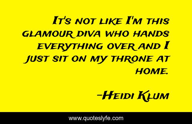 This page presents the quote "It's not like I'm this glamour diva who hands everything over and I just sit on my throne at home.". Author of this quote is Heidi Klum. This quote is about glamour, everything, hands,.