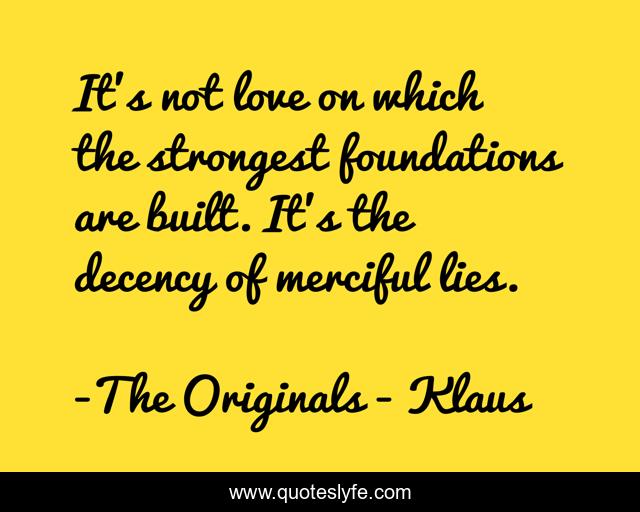 This page presents the quote "It's not love on which the strongest foundations are built. It's the decency of merciful lies.". Author of this quote is The Originals - Klaus. This quote is about enthusiasm, reality-of-life, love, inspirational, affection,.