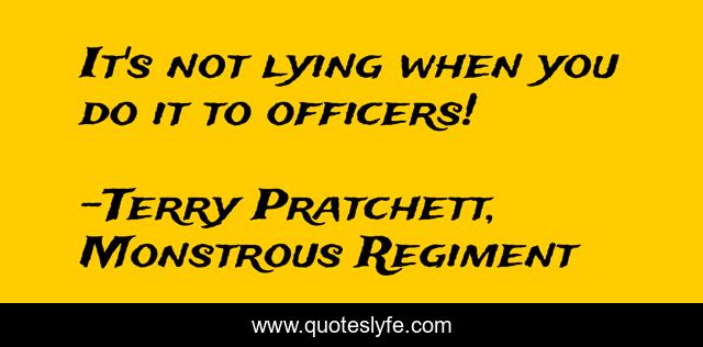 This page presents the quote "It's not lying when you do it to officers!". Author of this quote is Terry Pratchett, Monstrous Regiment. This quote is about superiors, humor, lying,.