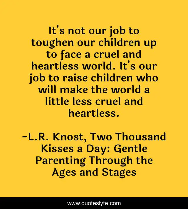 This page presents the quote "It's not our job to toughen our children up to face a cruel and heartless world. It's our job to raise children who will make the world a little less cruel and heartless.". Author of this quote is L.R. Knost, Two Thousand Kisses a Day: Gentle Parenting Through the Ages and Stages. This quote is about motherhood, children, parenting, inspirational, enthusiasm, childhood,.