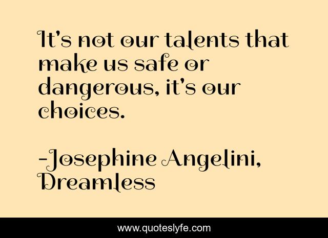 This page presents the quote "It's not our talents that make us safe or dangerous, it's our choices.". Author of this quote is Josephine Angelini, Dreamless. This quote is about choices, talents, dreamless, orion, helen,.