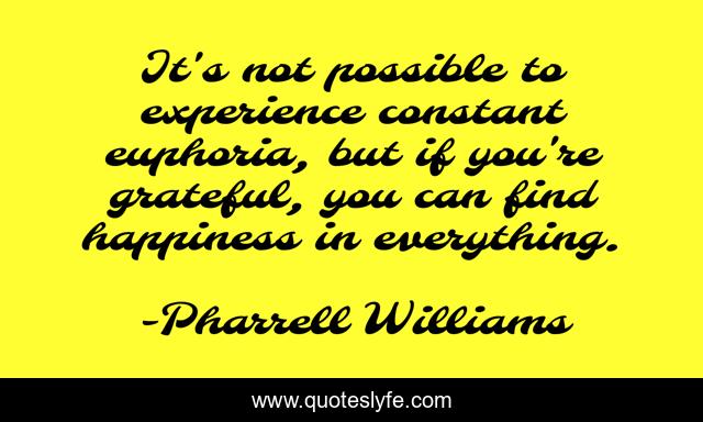 This page presents the quote "It's not possible to experience constant euphoria, but if you're grateful, you can find happiness in everything.". Author of this quote is Pharrell Williams. This quote is about experience, grateful,.