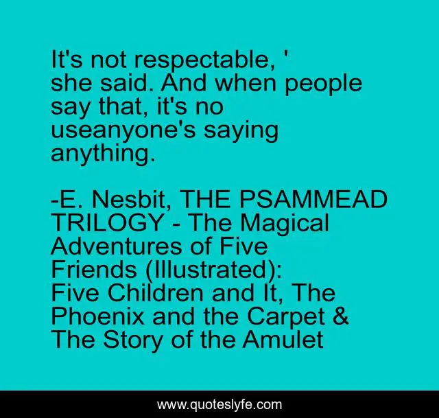 "E. Nesbit, THE PSAMMEAD TRILOGY - The Magical Adventures of Five Friends (Illustrated): Five Children and It, The Phoenix and the Carpet & The Story of the Amulet Quotes." Quoteslyfe.com, 2025. Sat. 06 Dec. 2025. <https://www.quoteslyfe.com/quote/It-s-not-respectable-she-said-And-163970>.