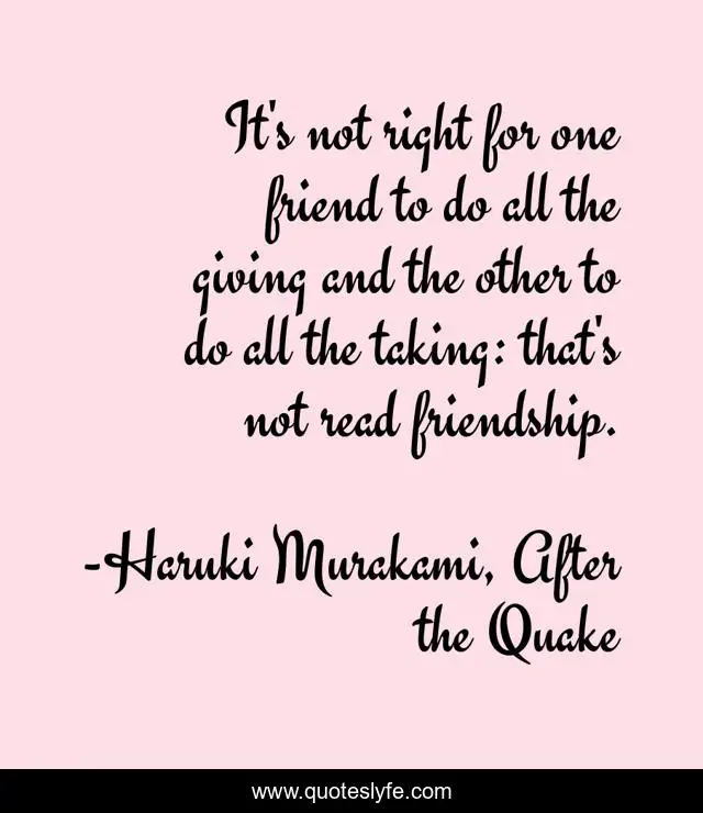This page presents the quote "It's not right for one friend to do all the giving and the other to do all the taking: that's not read friendship.". Author of this quote is Haruki Murakami, After the Quake. .