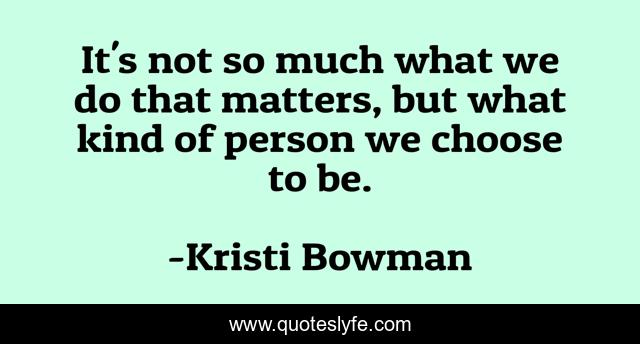 This page presents the quote "It's not so much what we do that matters, but what kind of person we choose to be.". Author of this quote is Kristi Bowman. This quote is about inspirational-life, character, choice,.