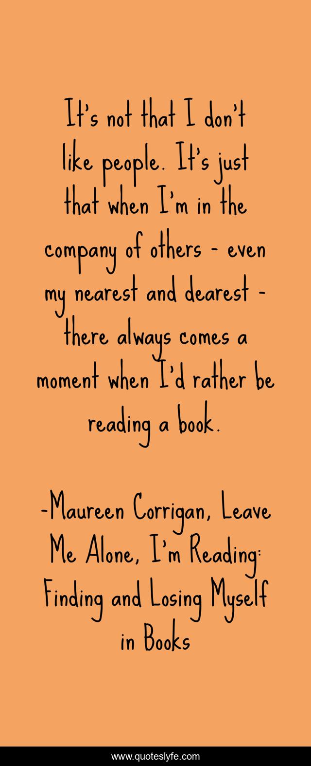 This page presents the quote "It's not that I don't like people. It's just that when I'm in the company of others - even my nearest and dearest - there always comes a moment when I'd rather be reading a book.". Author of this quote is Maureen Corrigan, Leave Me Alone, I'm Reading: Finding and Losing Myself in Books. This quote is about books, reading, people,.
