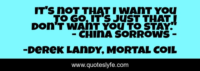 This page presents the quote "It's not that I want you to go, it's just that I don't want you to stay." - China Sorrows -". Author of this quote is Derek Landy, Mortal Coil. This quote is about humor, landy, leaving, derek, wanting, skuldugerry-pleasant,.