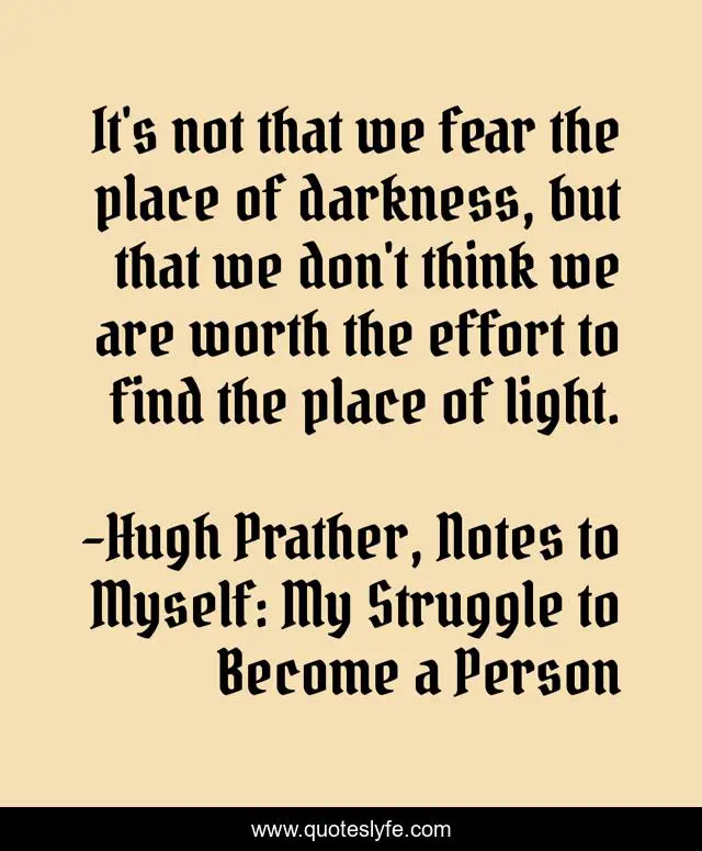 This page presents the quote "It's not that we fear the place of darkness, but that we don't think we are worth the effort to find the place of light.". Author of this quote is Hugh Prather, Notes to Myself: My Struggle to Become a Person. This quote is about light, inspirational, enthusiasm,.
