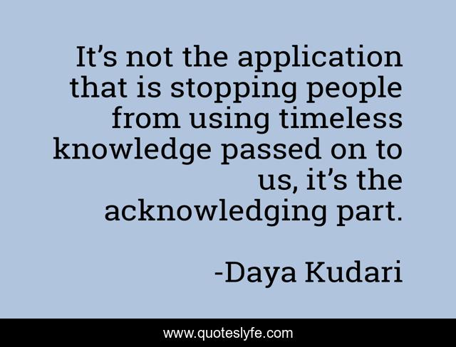 This page presents the quote "It’s not the application that is stopping people from using timeless knowledge passed on to us, it’s the acknowledging part.". Author of this quote is Daya Kudari. This quote is about daya-kudari, confidence, knowledge, positive, motivational, optimistic, inspirational, enthusiasm, inspire,.